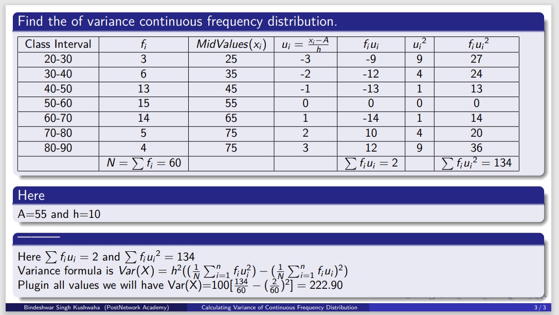 – This starts another frame (slide), which contains a **table** that will show how to calculate the variance of a continuous frequency distribution.