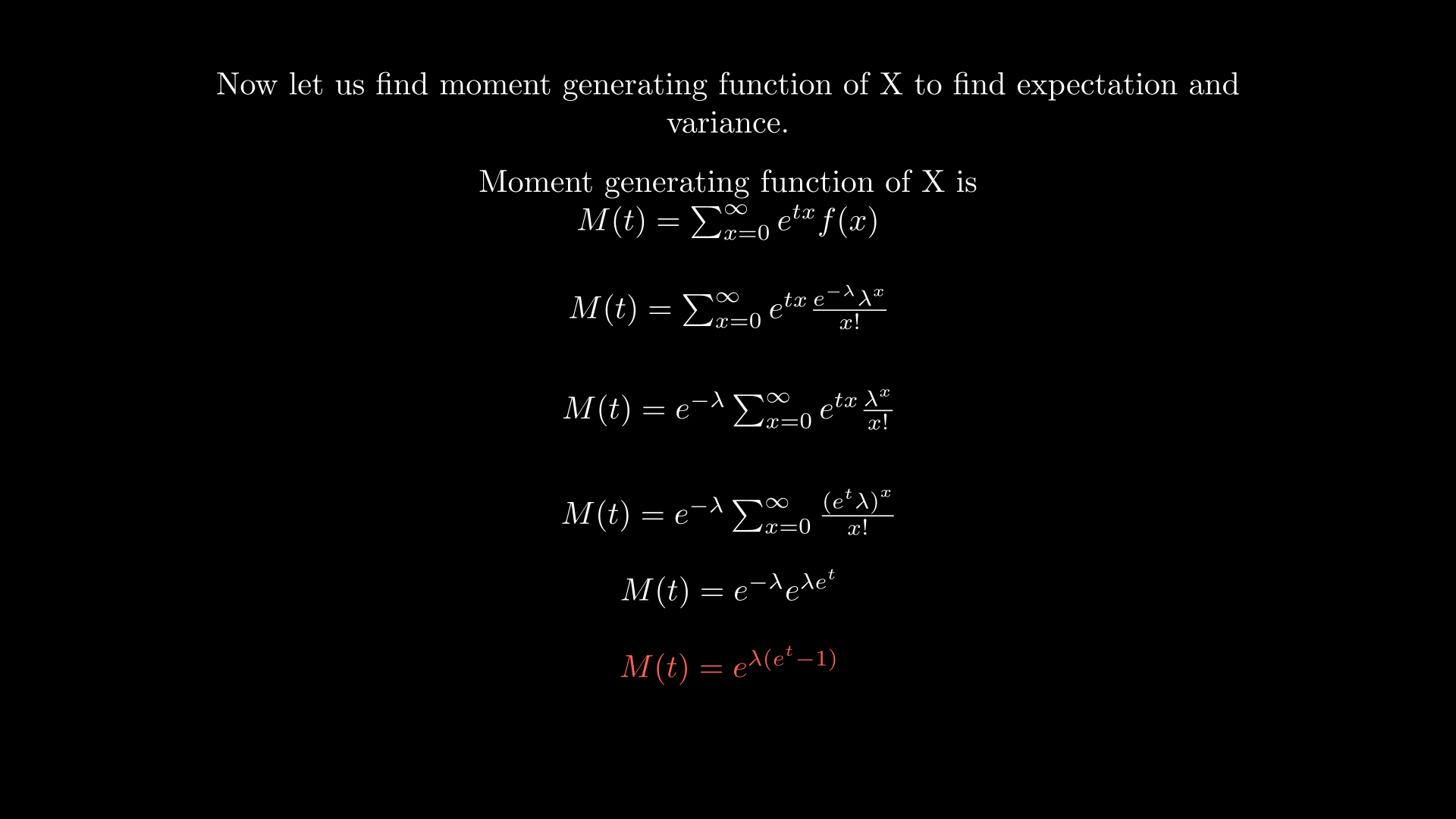 Where λ is the average rate at which events occur in a fixed interval of time or space. See how expectation is calculated using moment generating function.